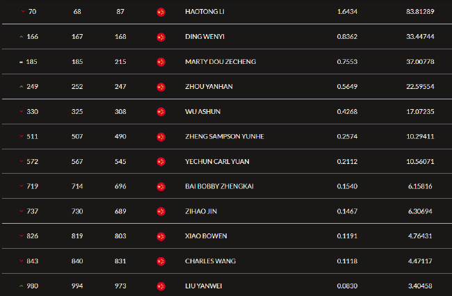 (9) 金子豪,826位(-7,737位(-7 ,他们的世界排名略微变动。依然是中国选手中唯一进入前100位的选手 。↑)